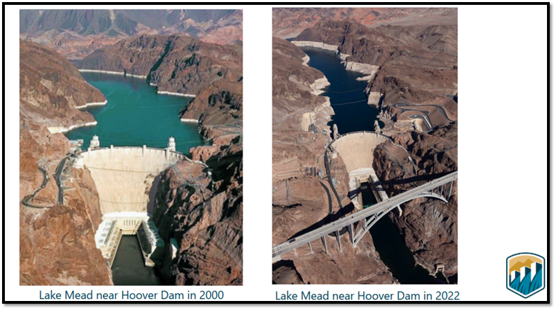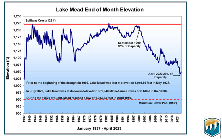 This graph illustrates that Lake Mead was at an elevation of 1,049.69 feet in May 1937. During the 1950s drought, Lake Mead reached an elevation low of 1,083.23 feet. By July 2022, Lake Mead reached its lowest elevation of 1,040.50 feet. As of May 14, 2023, Lake Mead is at 30% capacity.