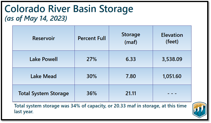 The table above indicates that as of May 14, 2023, there has been a slight increase in elevation at Lake Powell, 27%, from the April 2023 low of 23%. Note that the total system storage was at 34% capacity at this time last year.
