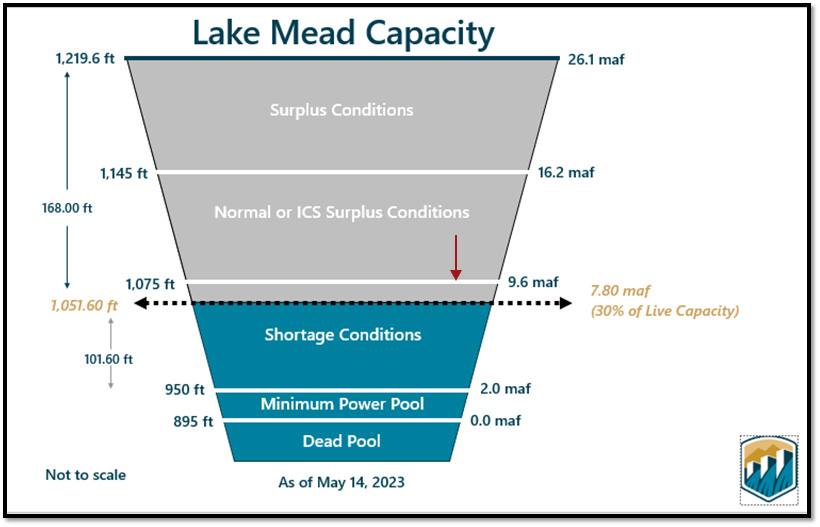 In January 2022, the Bureau of Reclamation declared a Tier 1 shortage at Lake Mead when the 1,075-foot elevation was reached. (See red arrow.) As of May 14, 2023, the elevation of Lake Mead was 1,051.60 feet. An elevation of 1,050 feet will trigger a Tier 2a shortage, and an elevation of 1,045 feet will trigger a Tier 2b shortage.