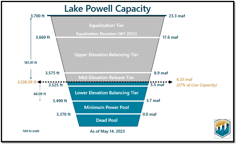 As of May 14, 2023, the elevation of Lake Powell was at 3,538.09 feet; at 6.33 MAF, that is only 27% of capacity. This should improve, however, as the mountain snows melt.
