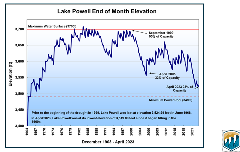 This graph indicates that in June 1968, Lake Powell was at an elevation of 3,524.99 feet, only 524.99 feet above the Mininimum Power Pool elevation of 3,490 feet, signifying droughts are cyclical. In September 1999, the elevation of Lake Powell was at 99% capacity. By April of 2023, the elevation is only 23% of capacity.