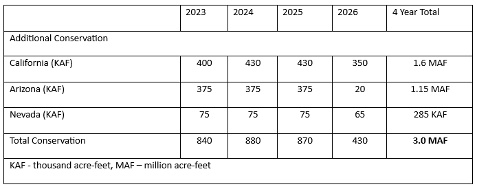 An agreement was reached on May 22nd among the lower basin states of California, Arizona, and Nevada to conserve 3 MAF over a three-year period. According to AMWUA, five municipalities, Phoenix, Glendale, Peoria, Scottsdale, and Gilbert have made commitments to leave 1.15 MAF of water over the next four years in the Colorado River system. The chart below shows the contribution of each of the three states.