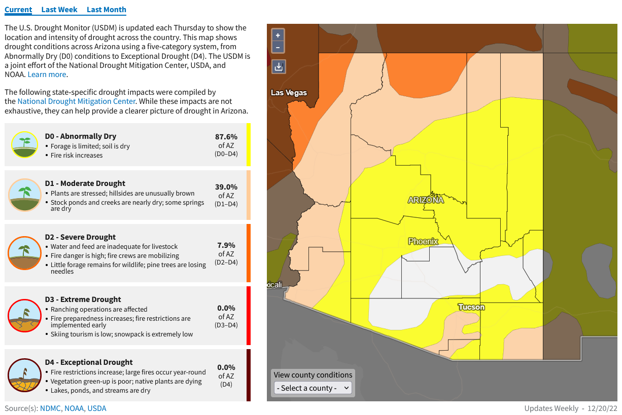 This site, which was current on December 15, 2022, depicts the drought conditions across the state and the corresponding percentages of Arizona for each category. You can even see what Last Week and Last Month looked like.