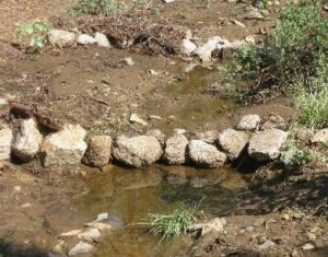 Passive systems can also be created using small check dams in a wash or ditch. Fig. 11 shows check dams at Highlands Center. A check dam can be simply a row of stones. Dirt accumulating behind the dams grows plants. Native Americans have used check dams to grow corn.
