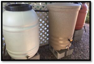 For a small inexpensive system, I recommend 50-60 gallon used food barrels such as the paintable containers shown in Fig. 1. These sell for about $40 including a small spigot (that you may want to replace) at the C-A-L Ranch store, 1048 Willow Creek Rd, Prescott. My house has 10 rain barrels with a total capacity of about 550 gallons.
